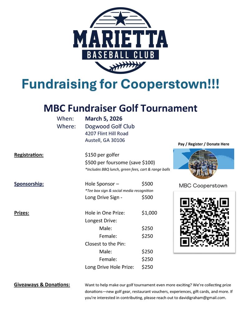 Marietta Baseball Club is not a 501(c)(3) organization. Contributions are not tax-deductible as charitable donations. All proceeds directly support sending our 12U team to Cooperstown Dreams Park in 2026 as well as benefiting our other age groups. All business donations will be posted on the team social media for advertising purposes.